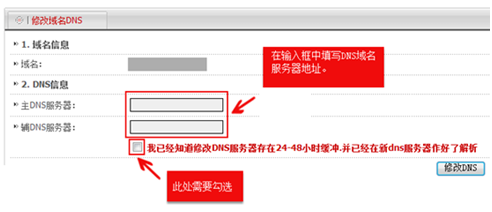 5、在輸入框中填寫域名DNS服務器地址,并勾選“我已經知道……”協議后點擊【修改DNS】按鈕。