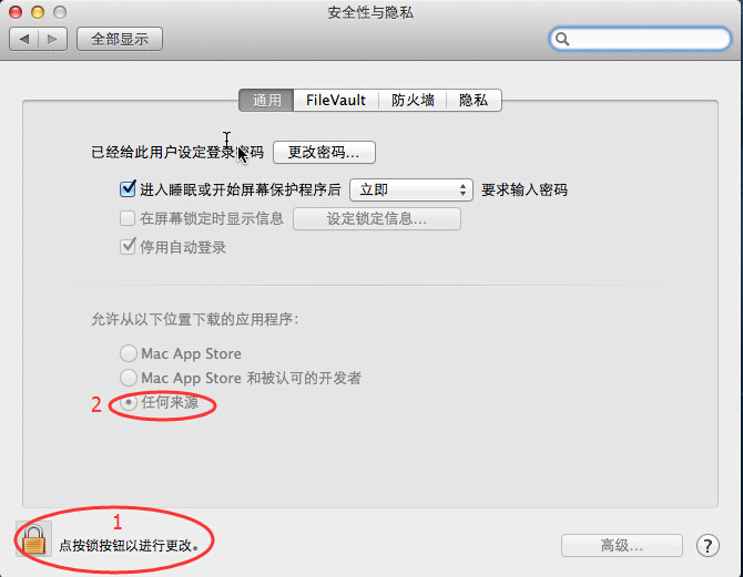 若安裝時提示“您的安全性偏好設置僅允許安裝來自 Mac App Store 和被認可的開發者的應用程序。” 請依次打開“系統偏好設置”——“安全性與隱私”。點擊左下角的鎖,輸入管理員密碼解鎖后, 在“允許從以下位置下載的應用程序”后選擇“任何來源”,即可正常安裝該軟件。如圖: