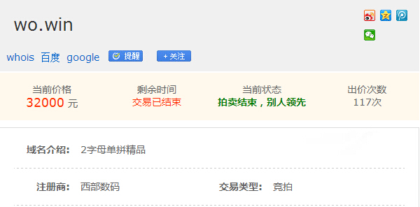 17.win可以解釋為“一起贏”本身是一個兩位數保留域名,拍賣過程中經過了88次競價,最終拍出46000元。wo.win可以理解為“我贏”,是一個兩字母域名,經過117次競價,最終拍出32000元。